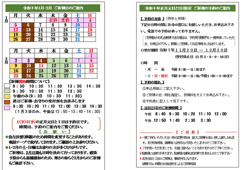 なお、予約及び新年1・2月の御祈祷日程、予約について掲載しておりますお葉書を